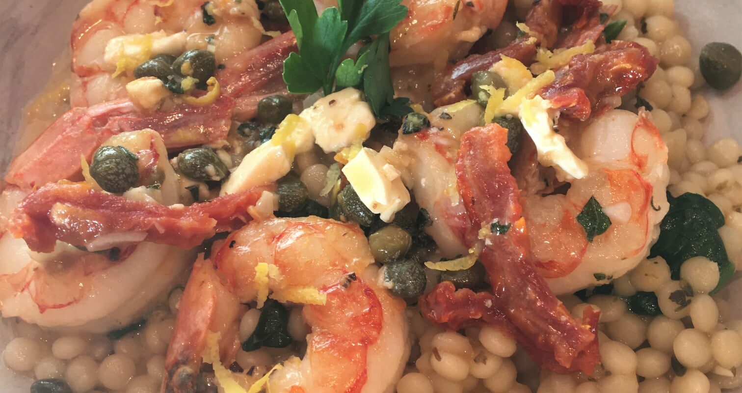 A spread of seasoned shrimp on couscous, with sun-dried tomatoes, capers, baby spinach, and feta. Not to be resisted!